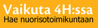 4H tarjoaa nuorillekin monia mahdollisuuksia, mitä sinä haluat tehdä? Haluatko vaikuttaa 4H:ssa, olisiko sinussa 4H-presidentti tai -ministeriaineista? Tietoa ja hakuohjeet 4H-nuorisotoimikuntaan.
